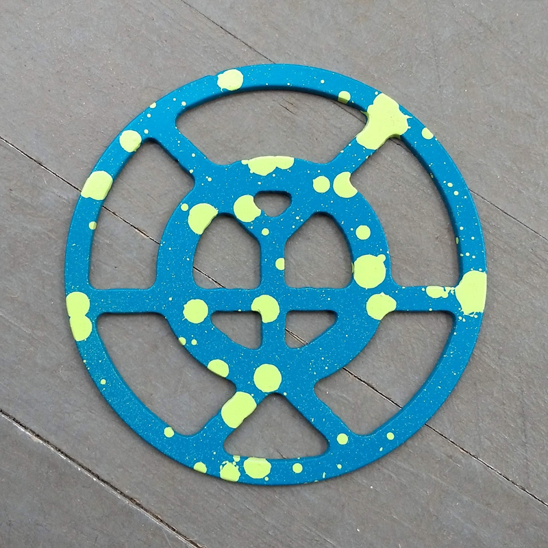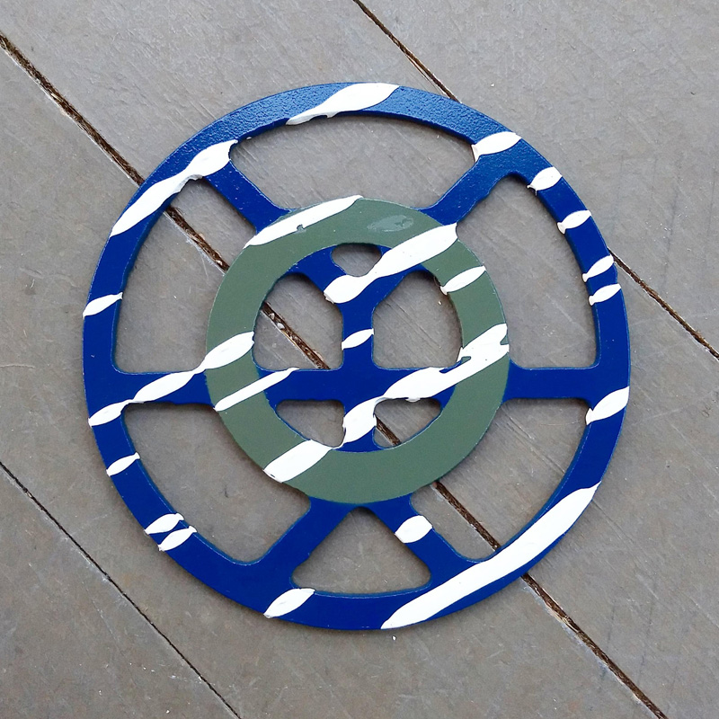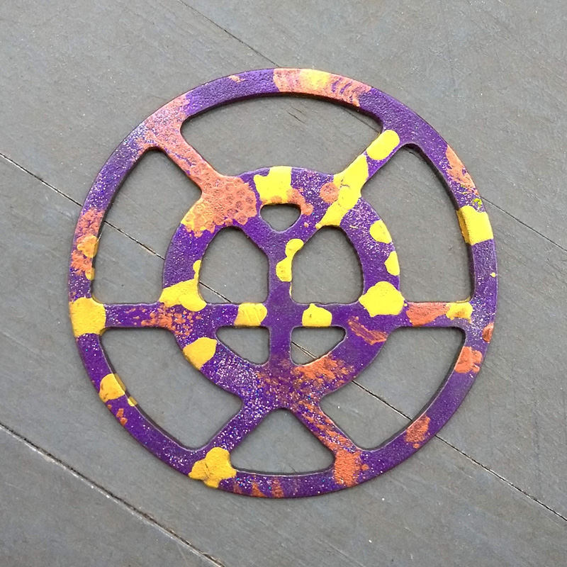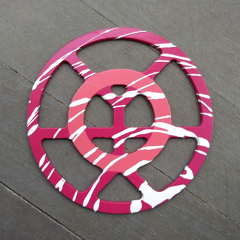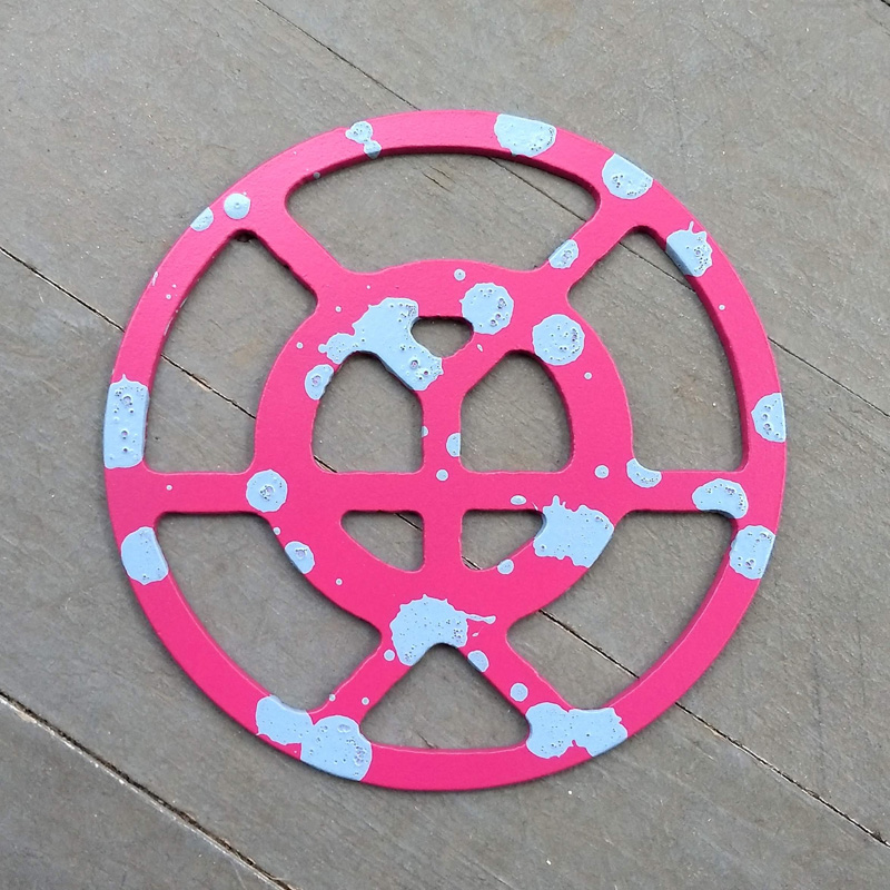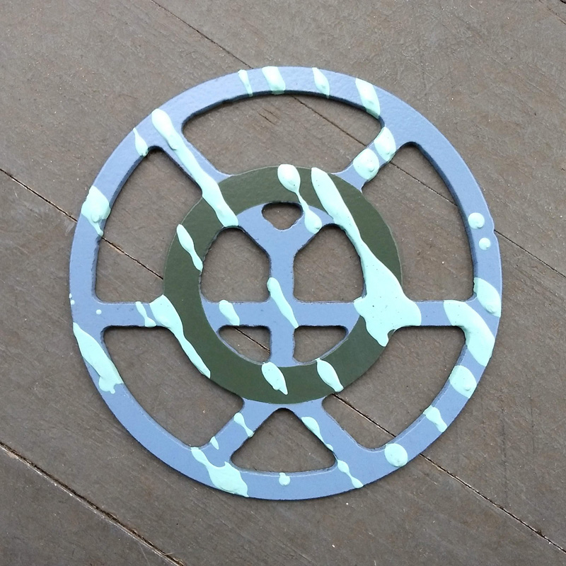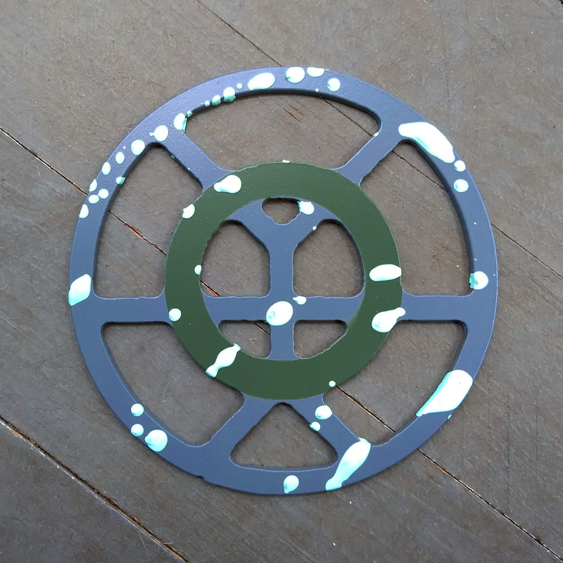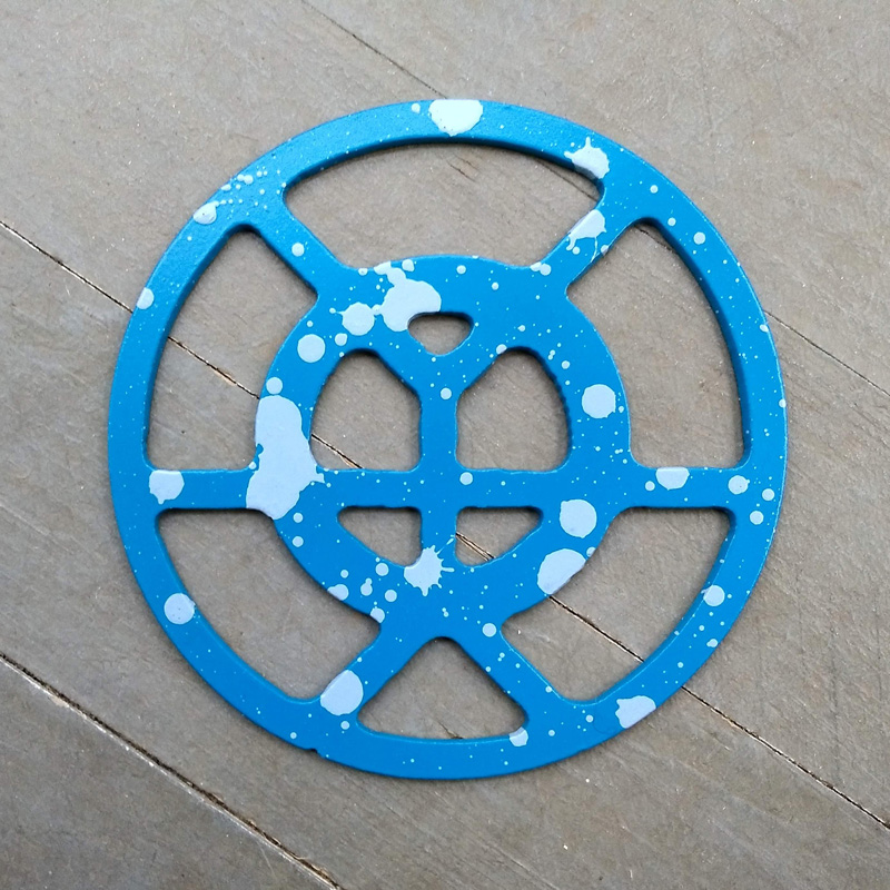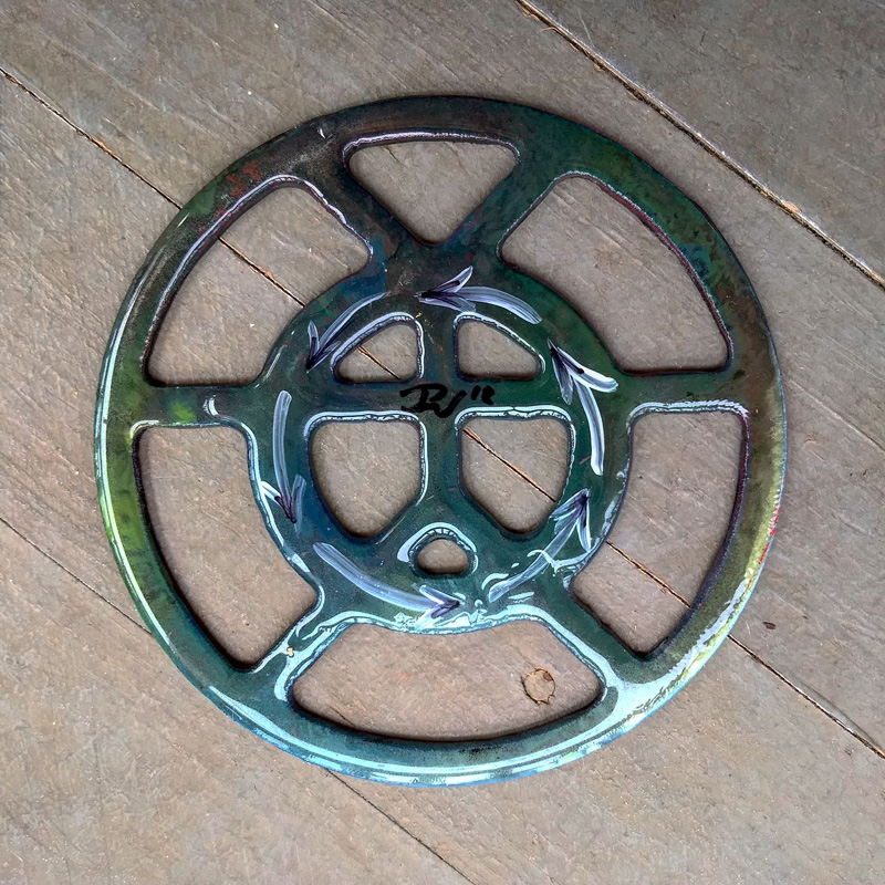 Each piece of art in this project is painted uniquely but they are all on the same 6-inch wide steel base. 2020's design is a stylized "Atl".