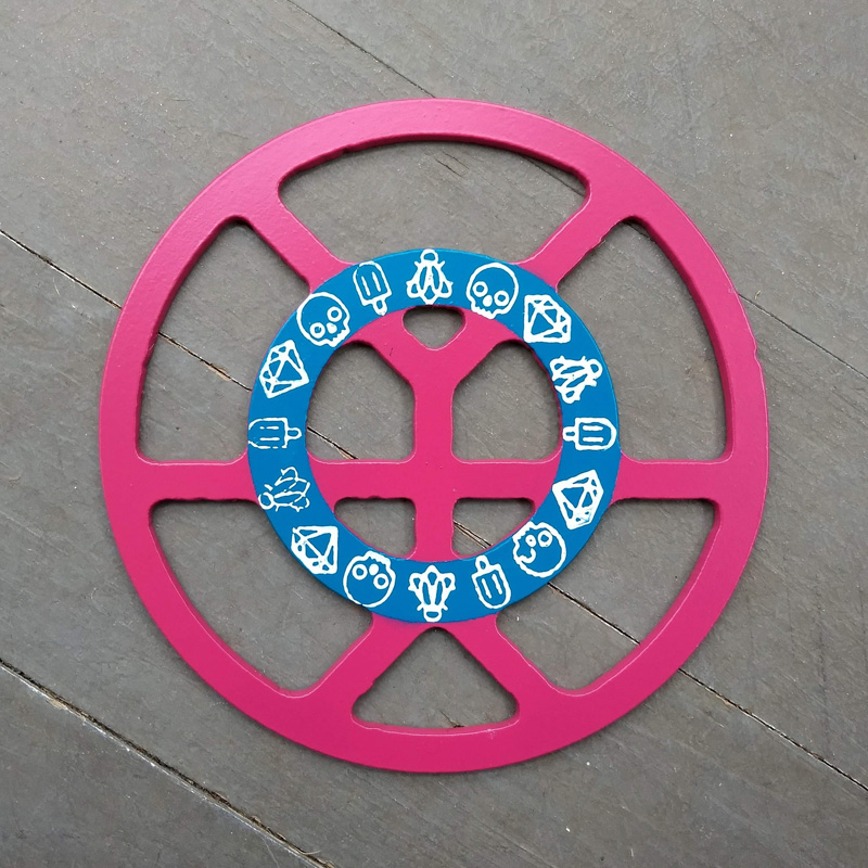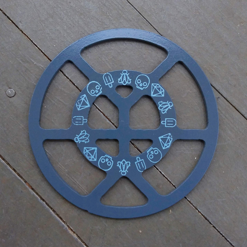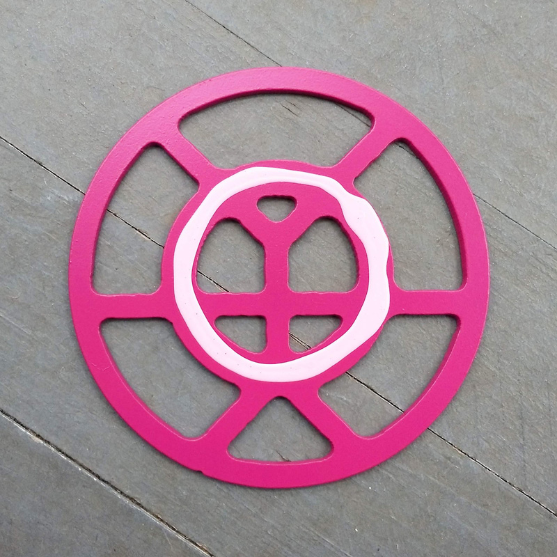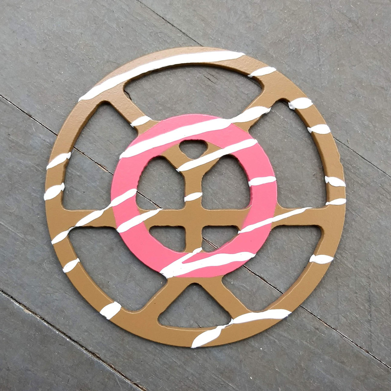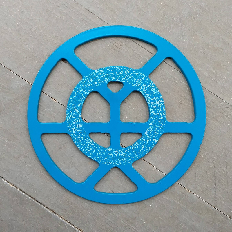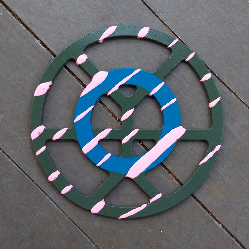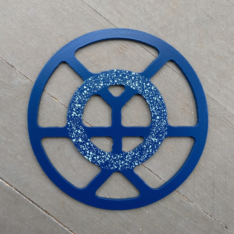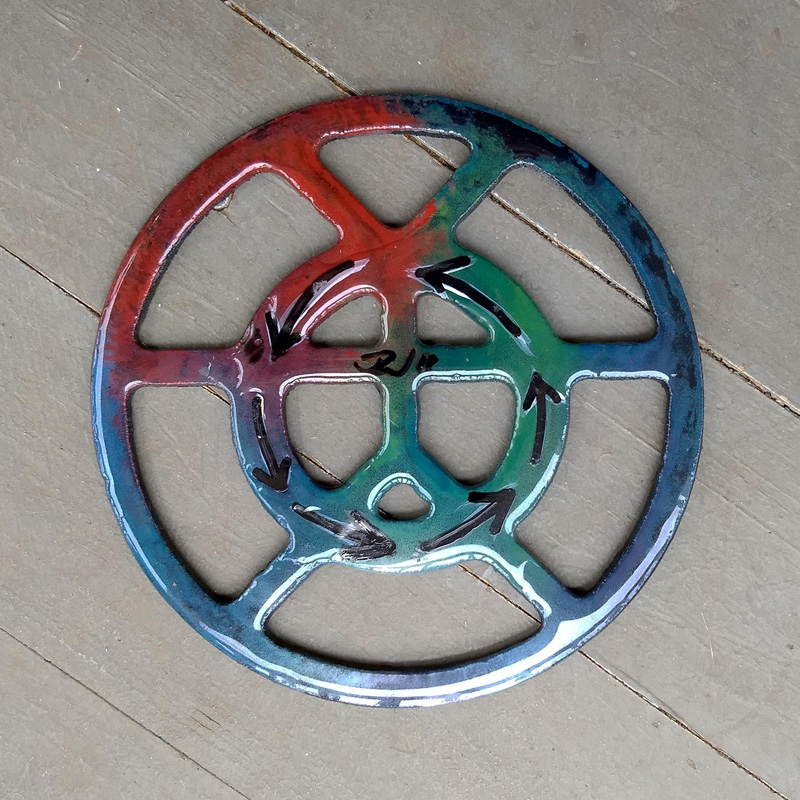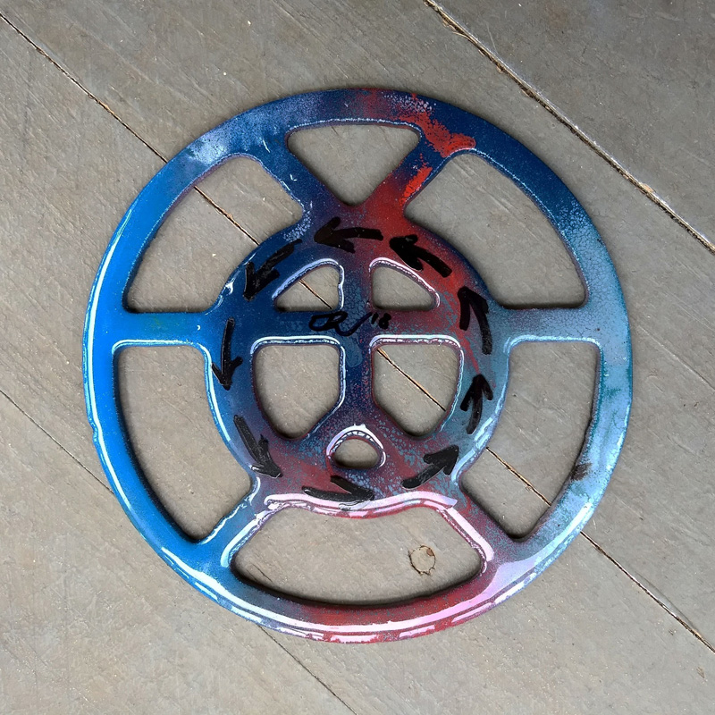 Each piece of art in this project is painted uniquely but they are all on the same 6-inch wide steel base. 2020's design is a stylized "Atl".